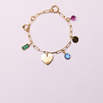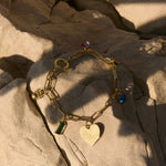 Avec son cœur doré, ses pierre serties vertes émeraudes et bleu piscine, sa perle rose et ses petites touches dorées, il ajoute du soleil à votre poignet.